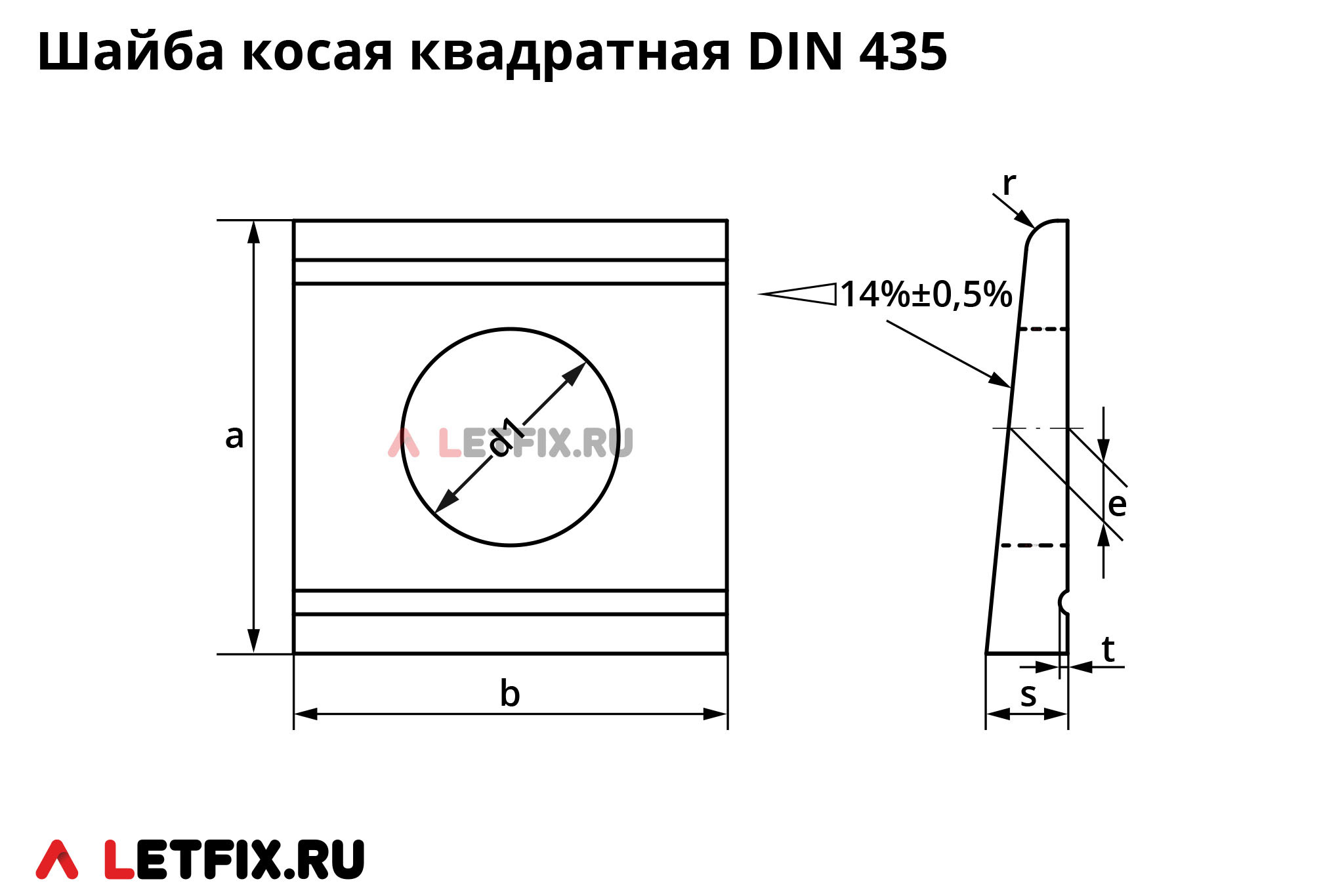 DIN 435 — шайба косая квадратная с уклоном 14% для полок двутавровых балок. Используется для подкладывания под головки болтов, винтов и гаек с целью выравнивания полок при проведении строительно-монтажных работ, а также при проведении производственных работ в машиностроении и станкостроении.
