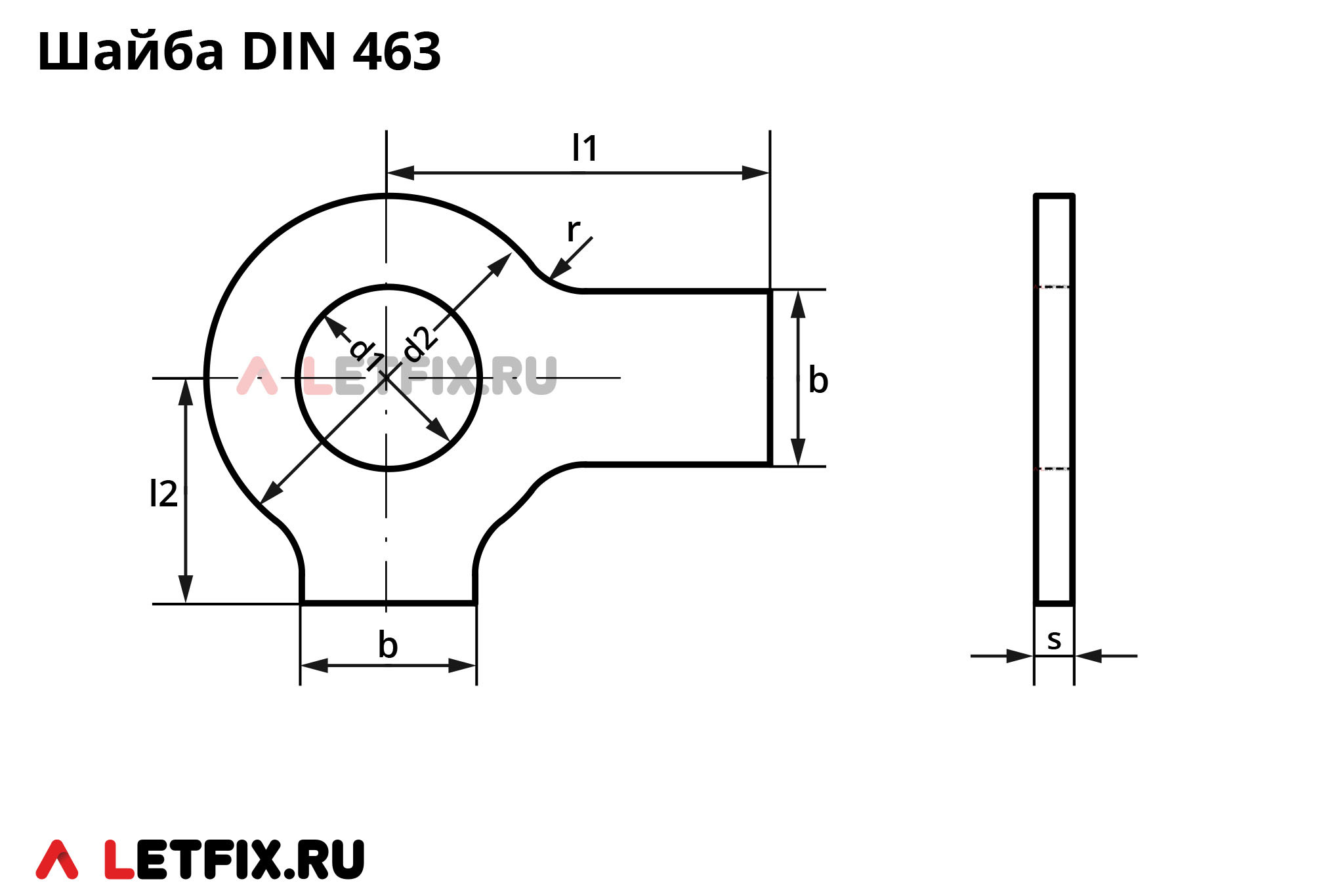 | Для размера резьбы | d1, внутренний диаметр, в мм | b, ширина лапок, в мм | d2, в мм | l1, в мм | l2, в мм | s, толщина шайбы, в мм | r, в мм |