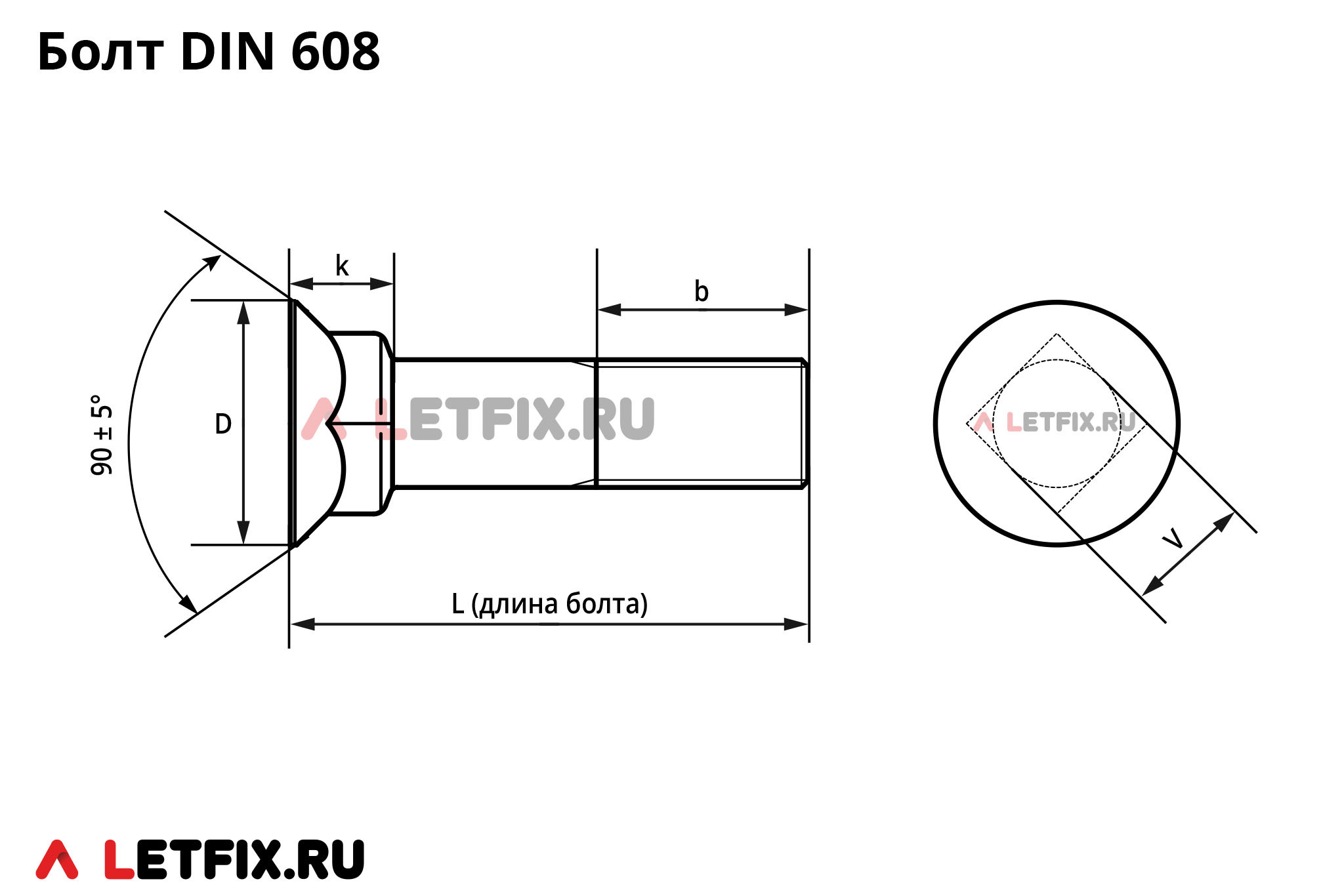 Стандарт DIN 608 для болтов с потайной головкой с квадратным подголовником регламентирует только размеры резьбы М10 и М12. Аналог болтов DIN 608 в стандарте ГОСТ — ГОСТ 7786-81, в котором регламентированы размеры резьбы от М5 до М20. Различия DIN 608 и ГОСТ 7786 описаны под таблицей.