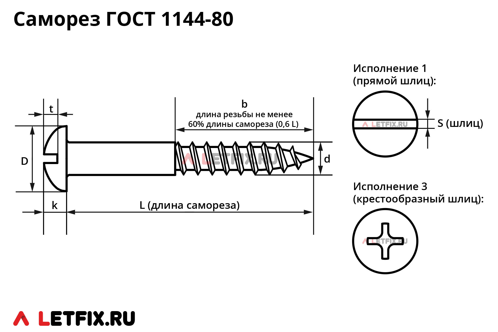 ГОСТ 1144-80 — саморез (шуруп) с полукруглой головкой с прямым шлицем Slotted (SL) или с крестообразным шлицем Phillips (Ph). Используется для крепления в пластмассу, древесину и металлы (при предварительном сверлении).