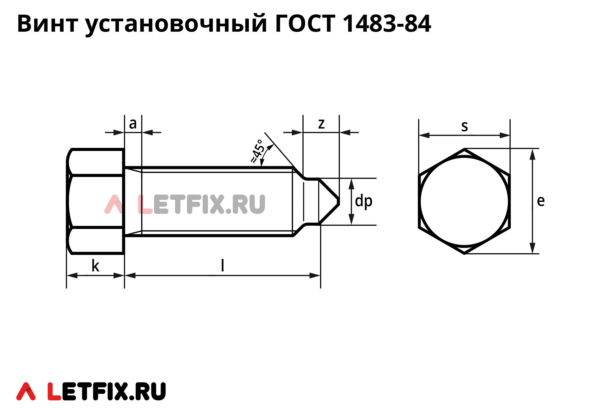 ГОСТ 1483-84 — установочный винт с уменьшенной шестигранной головкой и ступенчатым коническим концом (болт с уменьшенной шестигранной головкой и коническим концом). Применяется в машиностроении, станкостроении, судостроении, строительстве и в других производственных отраслях.